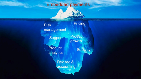 Matt Brown, a venture capital investor at Matrix and a close student of embedded payments, uses the analogy of an iceberg: it looks like an integration problem, but that’s just the tip. Beneath the surface is where the real value — revenue expansion, tighter customer lock-in, higher LTV — is hiding. However, as Matt warns, that’s also where the more difficult problems are hiding: Many companies think that a few lines of code and hours of work will yield a whole new monetization model. However, integrating payments is just the tip of the iceberg, and real success requires more than product and engineering work. |