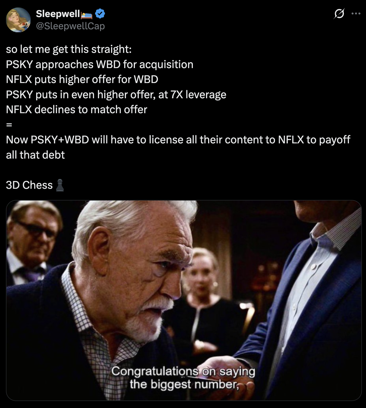 The 66-year old Zaslav was able to juice the value of Warner Bros, all while Netflix and Paramount both saw sell-offs of 30%+ (shareholders terrified by the debt).