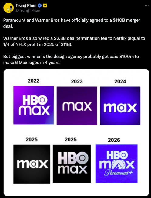 Ultimately, the potential spin off was moot. Paramount eventually pushed its offer valuing Warner Bros at $50B (including debt) to $82B of equity (and $110B enterprise value overall).