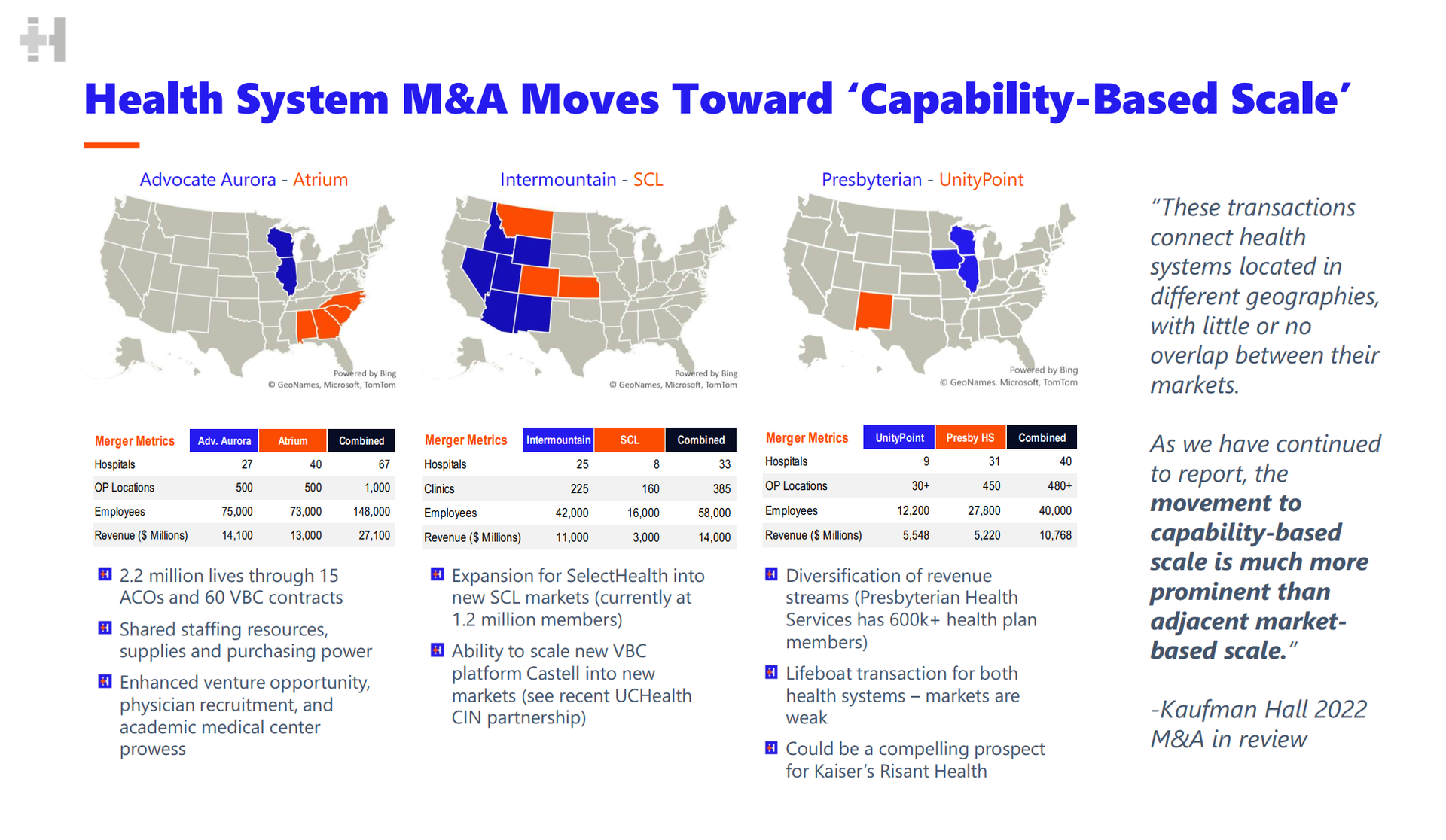 Bigger picture: Along with Advocate-Atrium, SCL-Intermountain, or even Ascension-AmSurg, health systems more than anything are looking to survive, and by combining forces and cross-subsidizing winning and losing markets, capability-based scale allows them to stay in the game and remain competitive against payors and disruptors. |