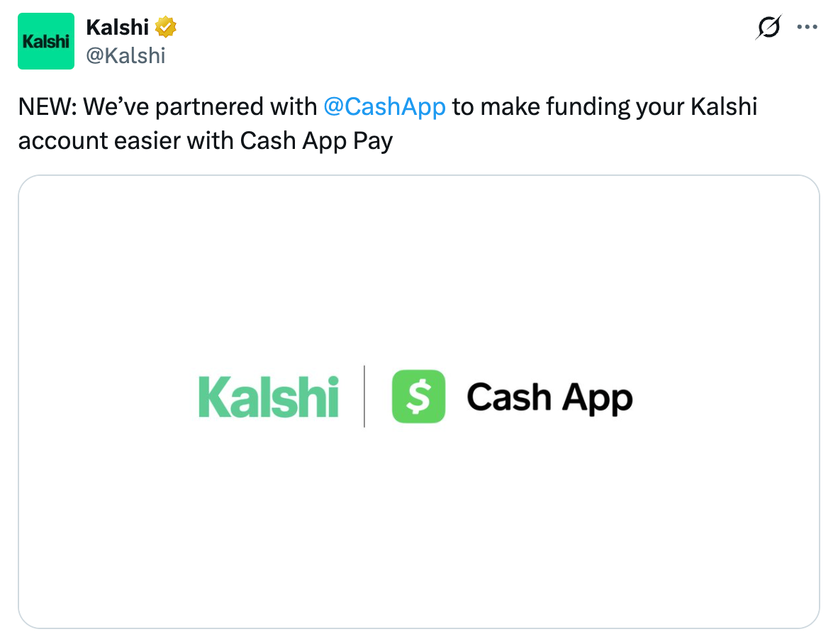 Cash App has partnered with Kalshi so that Cash App users can easily fund their Kalshi accounts with their Cash App balances: |