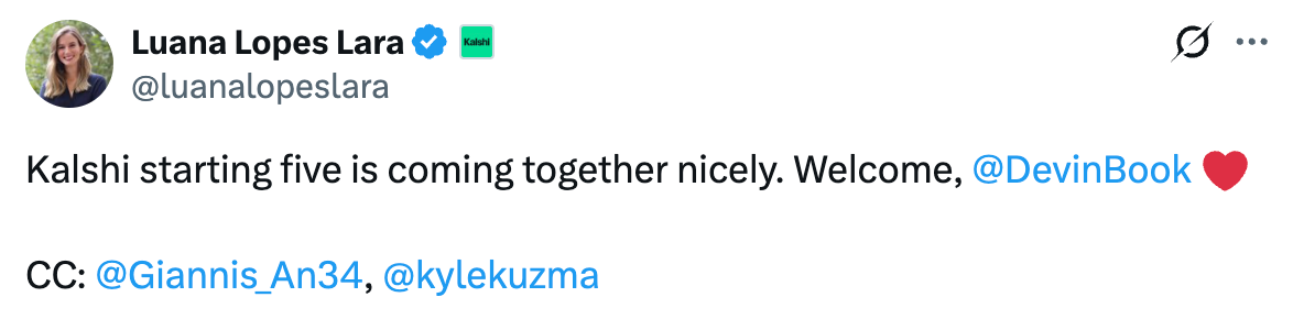 Kalshi is leaning into athlete endorsements as a way to grow brand awareness. Specifically, it has recruited Giannis Antetokounmpo and Kyle Kuzma as investors. The company says that it is trying to compile a “starting five” of NBA spokesmen: |