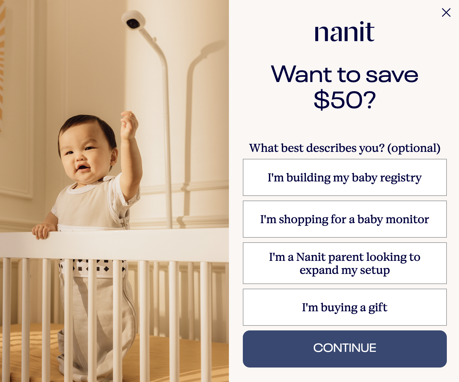 Nanit: The micro-yes email capture quiz popup has an escape! Notice the word (optional). Also notice that the CTA says CONTINUE.