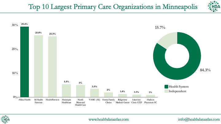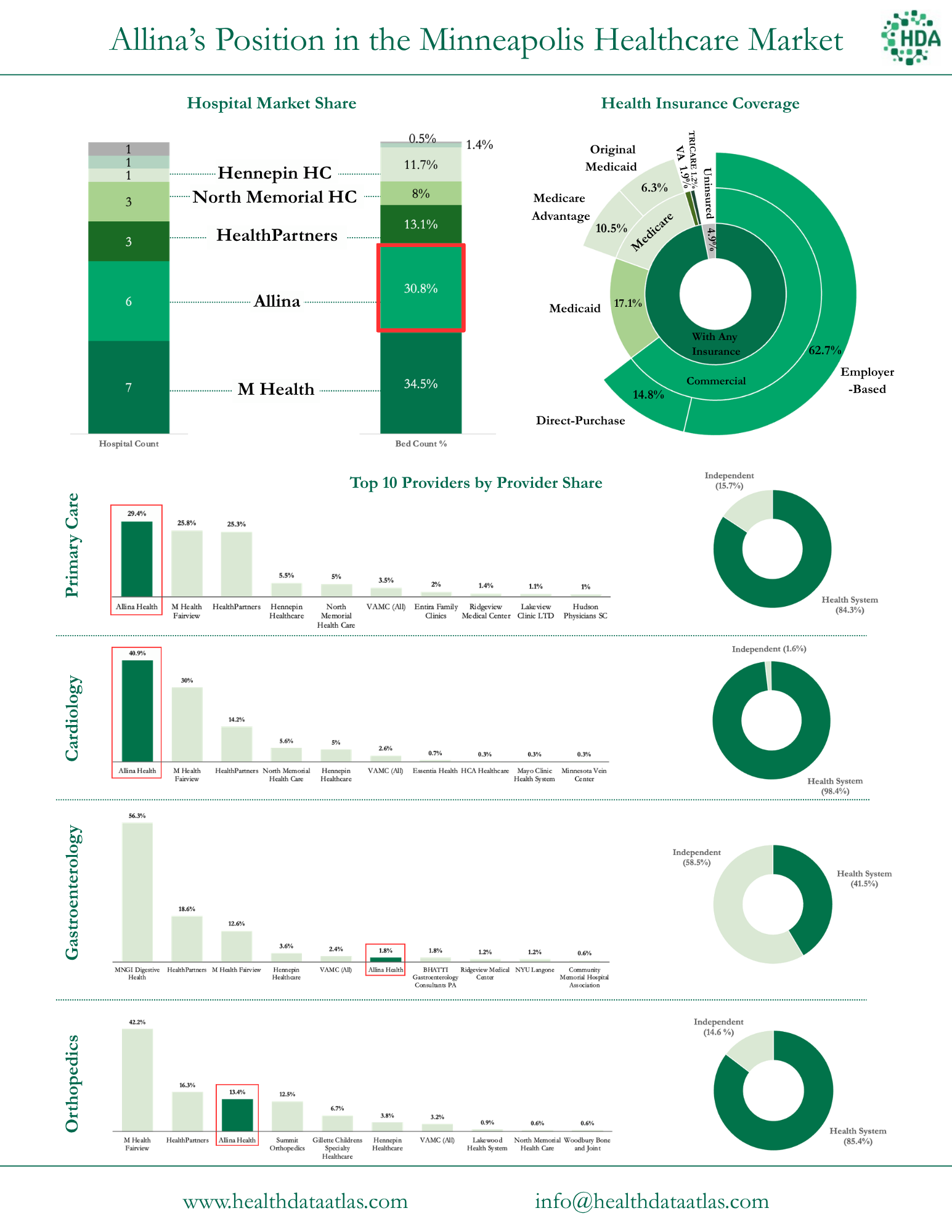 Allina also has decent market positioning. Mayo as an elite national academic institution dominates the highest acuity and destination care and the Rochester corridor while M Health Fairview operates the local academic medical center (for now) and the U of M relationship. Allina’s lane is community-based, primary-care-led, metropolitan healthcare, and on the physician practice side the system also needs to contend with large independent multispecialty groups.